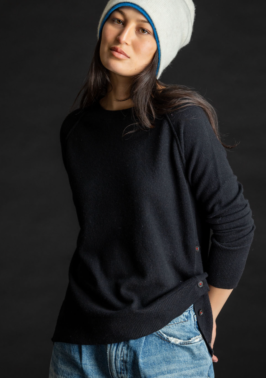 The Side Placket Crew features a relaxed fit through the main body, a longer body length, and a slimmer fit at the sleeves for a balanced look. Beautiful shallow crew echoes the shape of the raglan armhole seam line for the elegant and relaxed vibe.